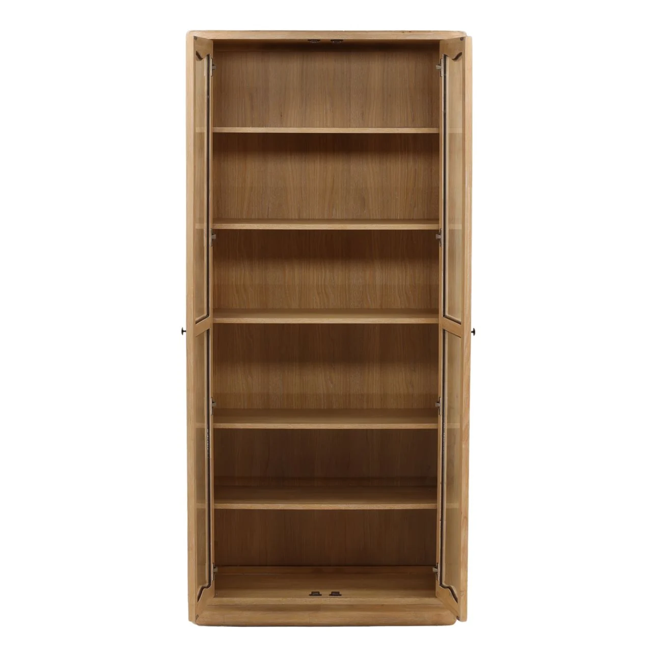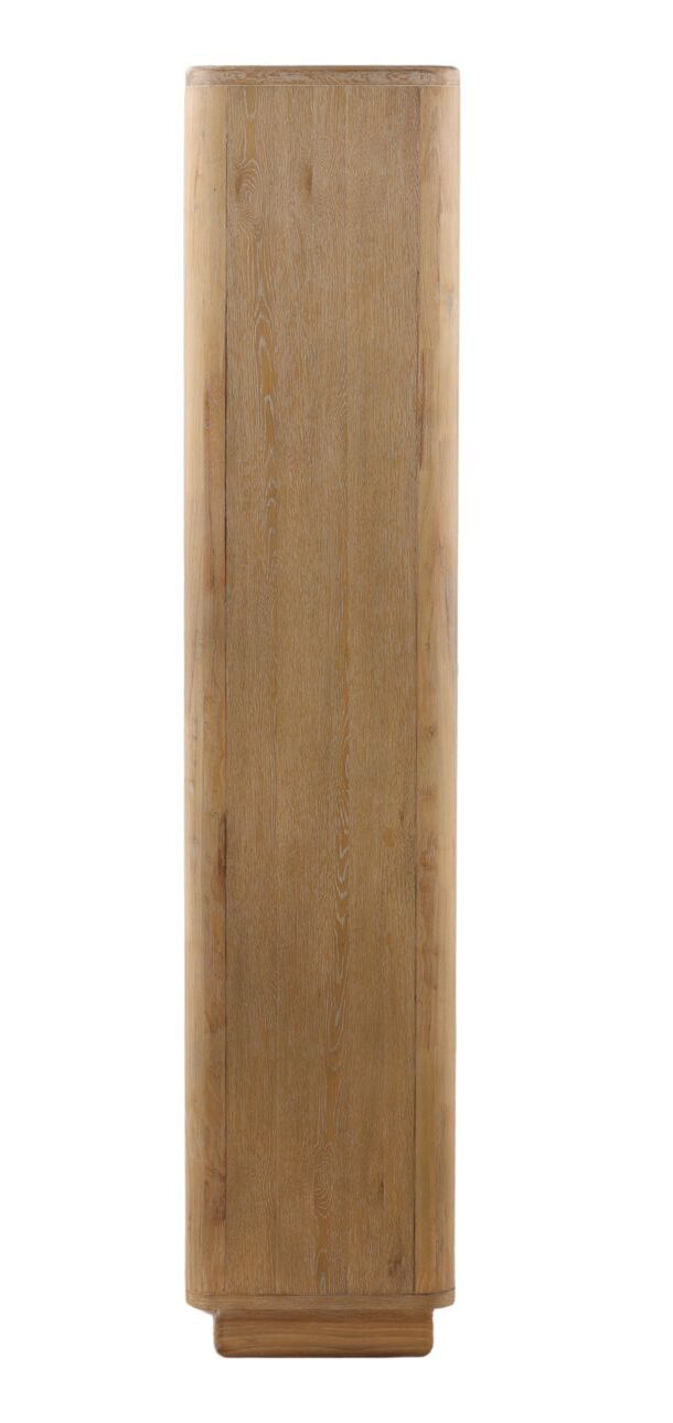 Discover the Dayne Glass Cabinet, a stunning display and storage solution. Crafted from Oak veneer  and rubber wood with a light natural finish, it perfectly blends style and functionality for your living space.  Stylish glass doors provide a clear view of the shelves inside, making it an ideal display case for books, decorative objects, or cherished heirlooms.