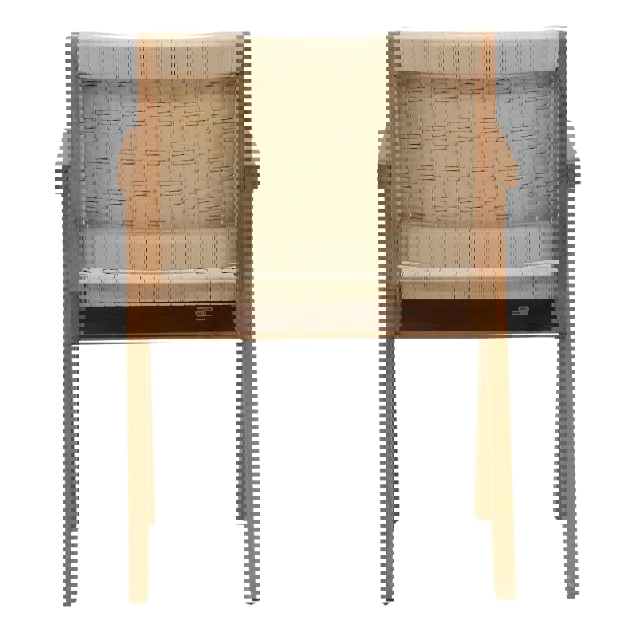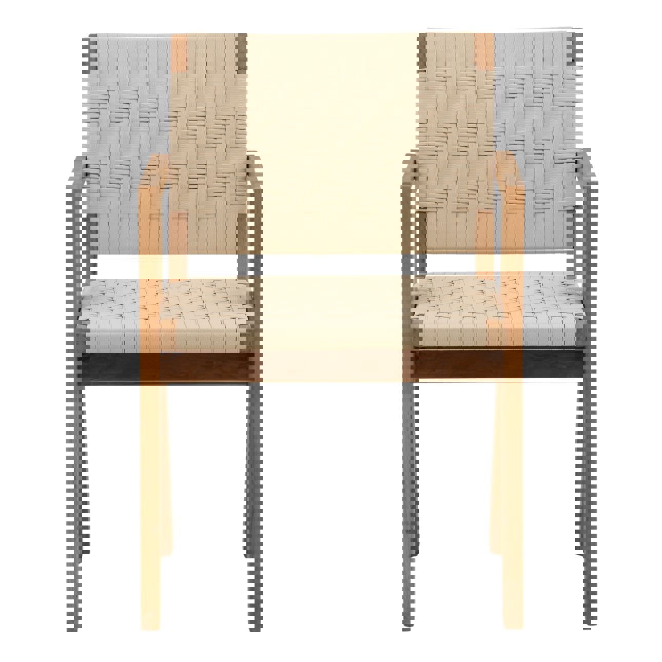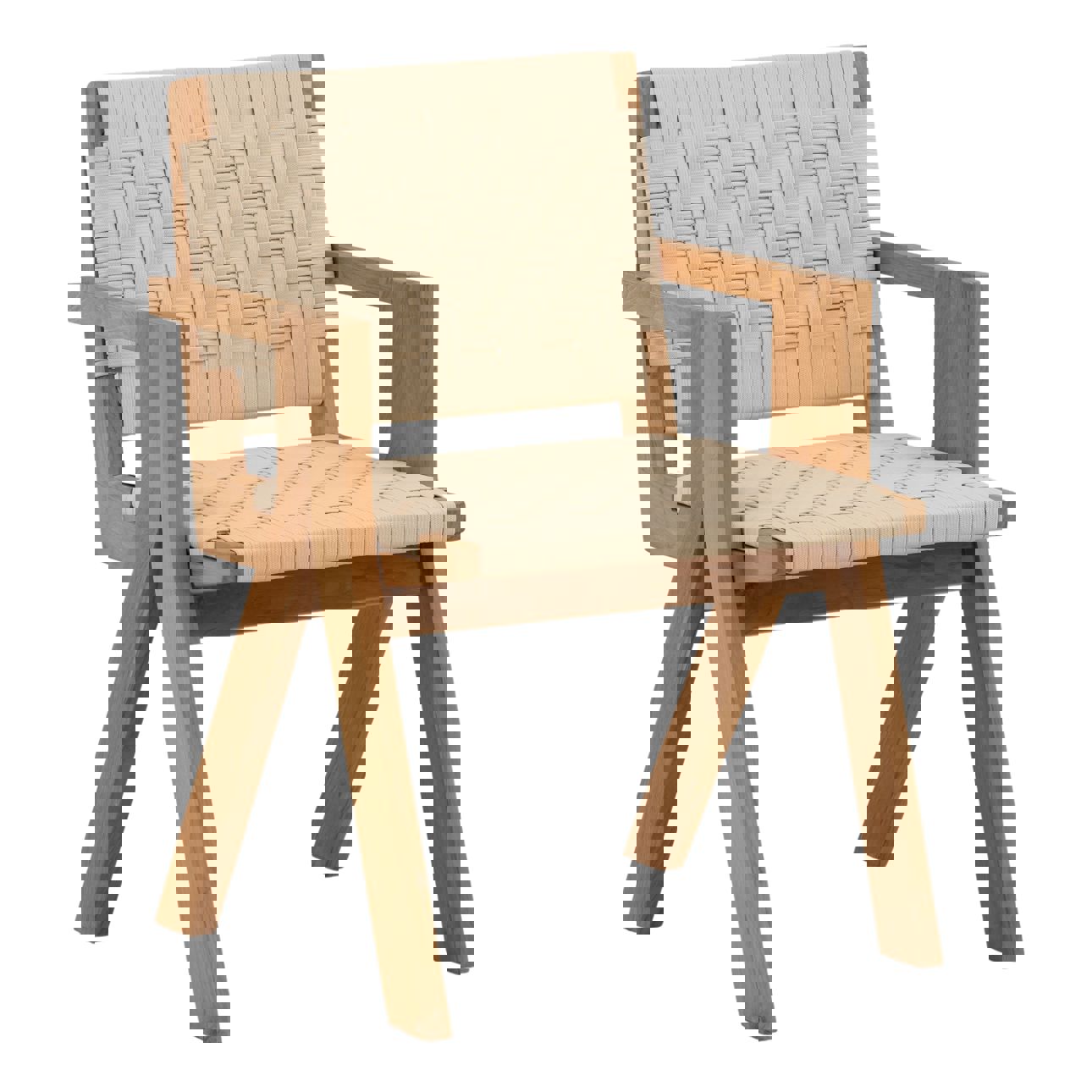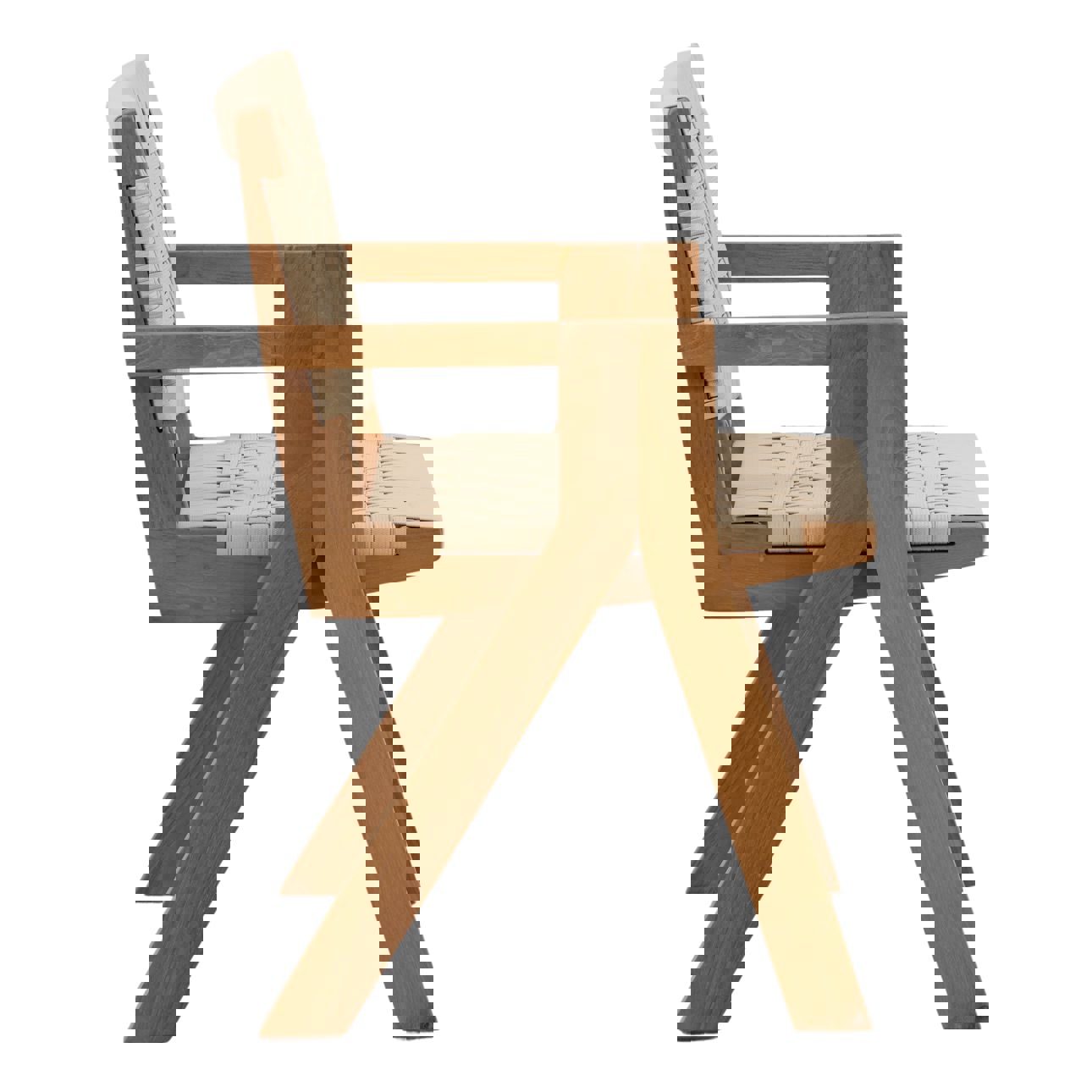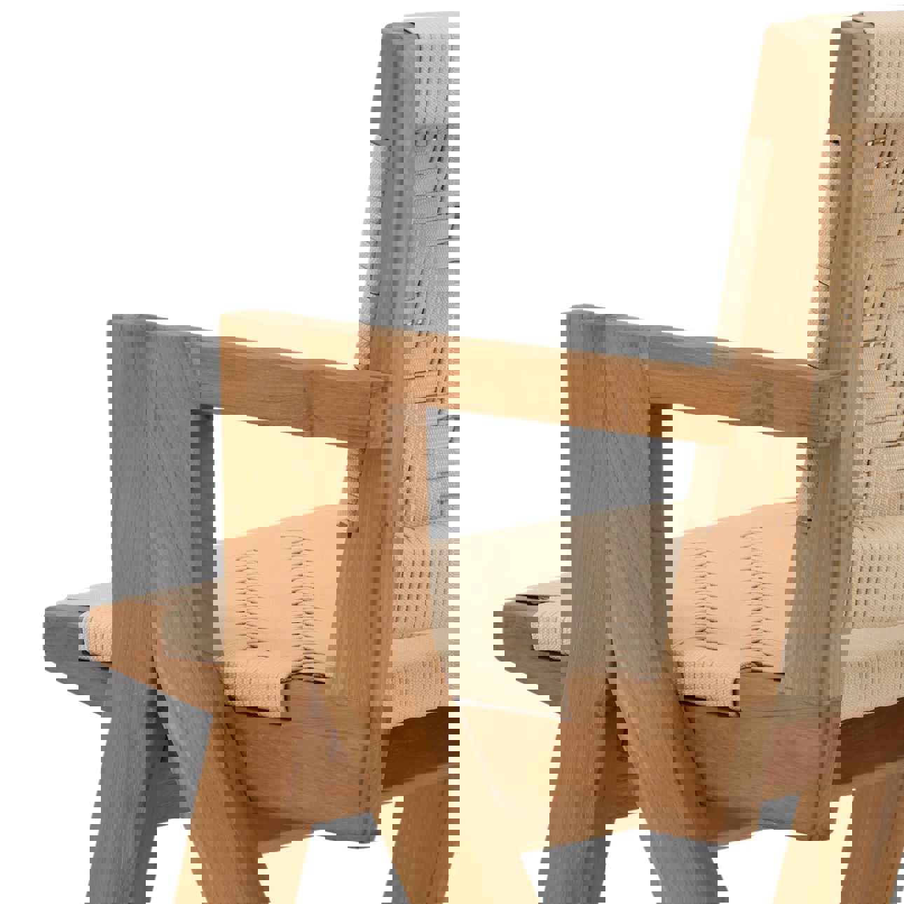 This handcrafted dining chair merges modern design with organic elegance. Fashioned from solid teak in a natural finish, it radiates a warm tone that provides a beautiful contrast to its cream outdoor flat rope. The woven flat rope detailing on the seat and back adds rich texture and artisan appeal.