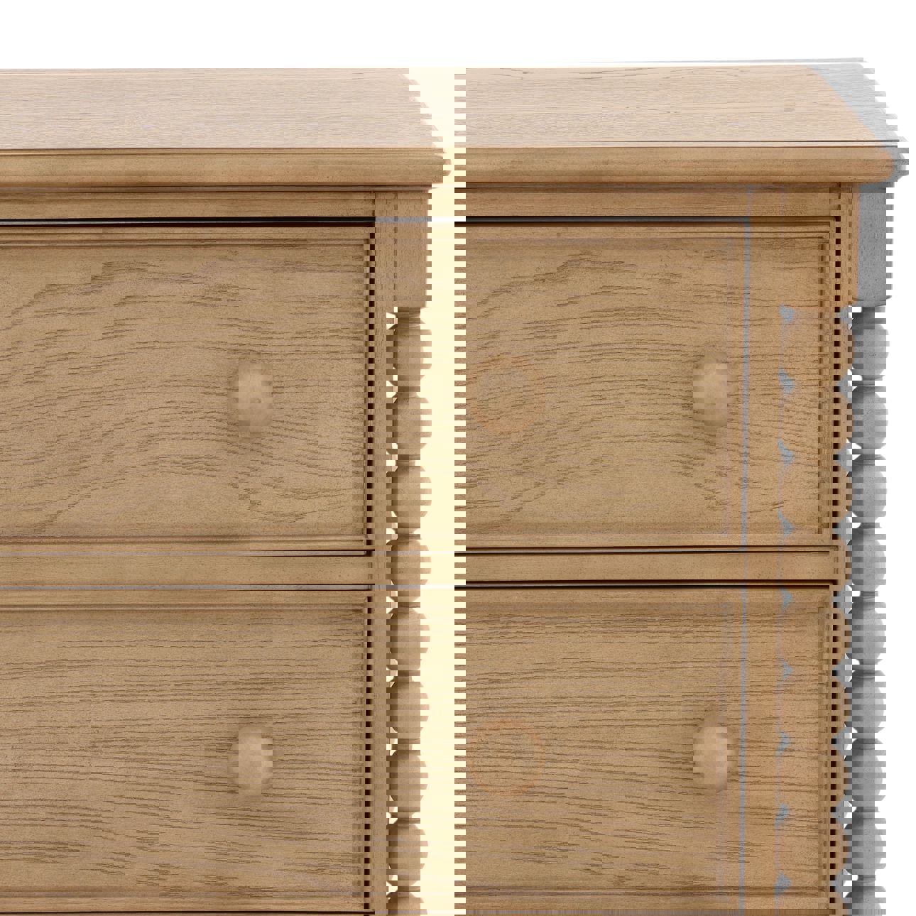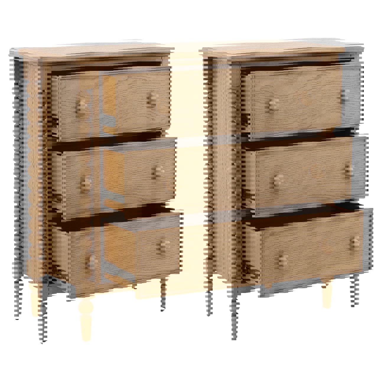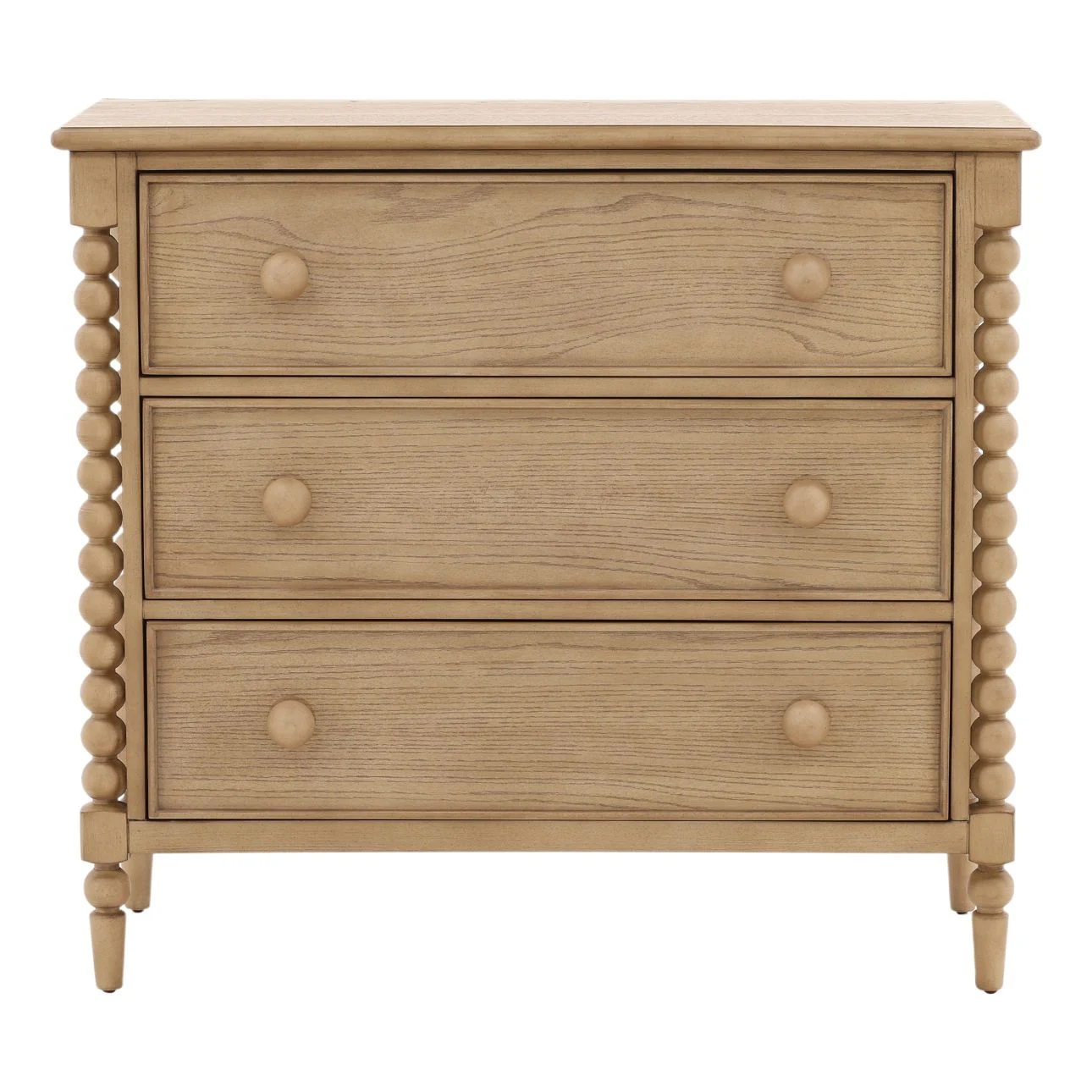 This charming 3-drawer dresser doubles as a nightstand, offering a versatile and compact storage solution for any room. Crafted from rubber wood and oak veneer in a natural finish, it features rounded spindle accents on the sides for a vintage-inspired elegance. Perfect for smaller spaces, its three spacious drawers provide ample room for organizing essentials while maintaining a stylish and functional aesthetic.