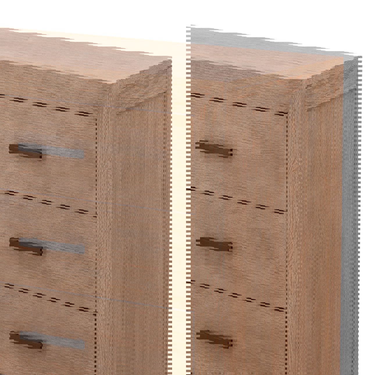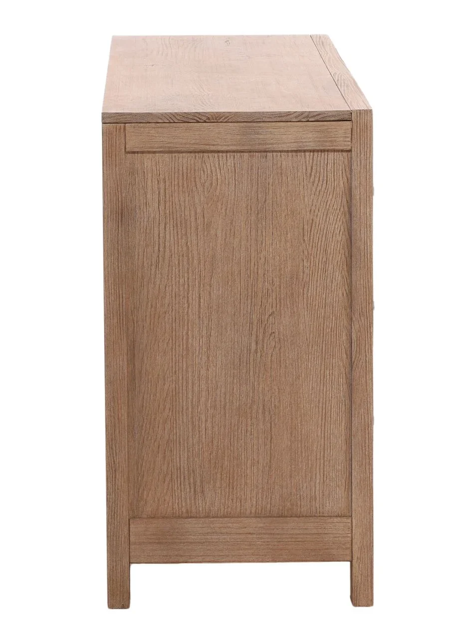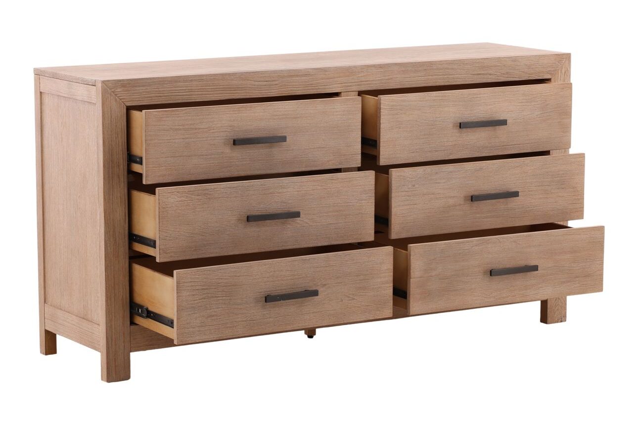 This six-drawer dresser, crafted from pine wood and pine veneer, features a light warm wash finish that enhances the natural grain. Clean lines, framed drawer fronts, and sleek black metal handles give it a modern yet timeless appeal. Spacious drawers provide ample storage for clothing, linens, or essentials, making it a stylish and functional addition to any bedroom.