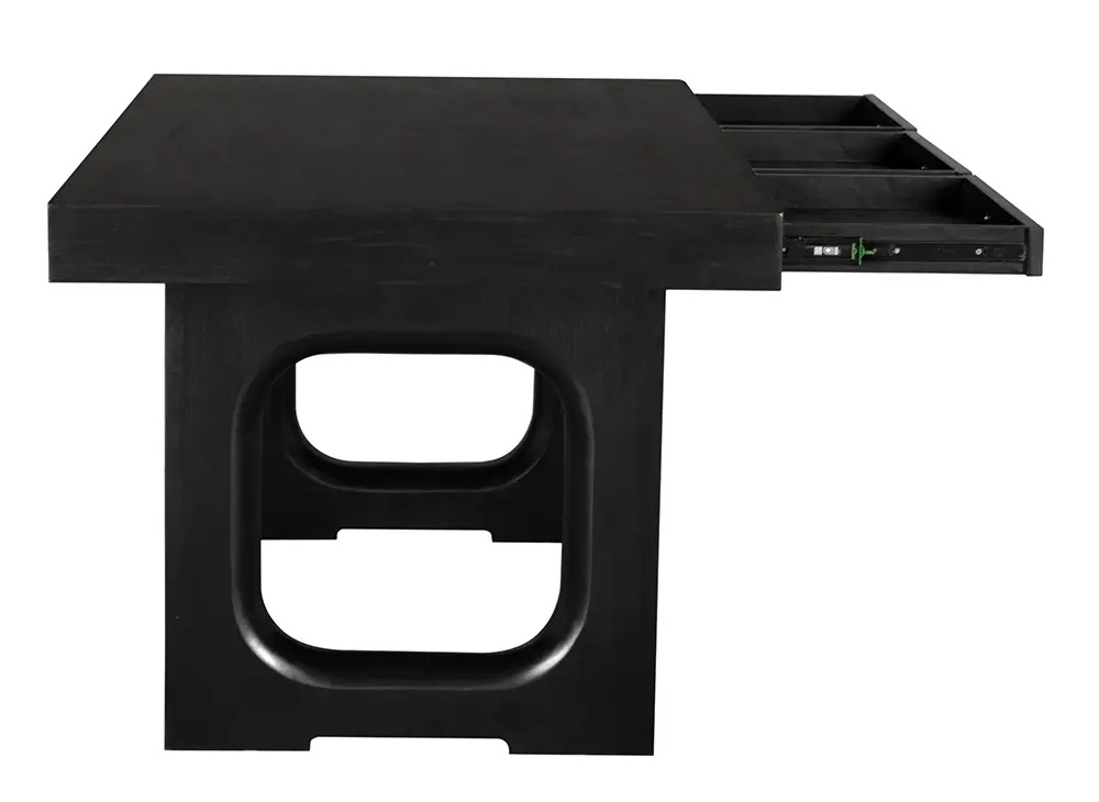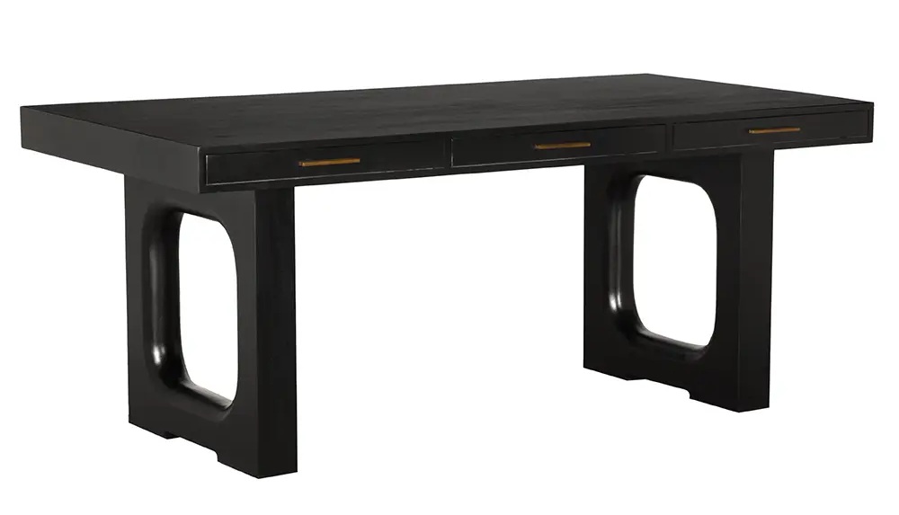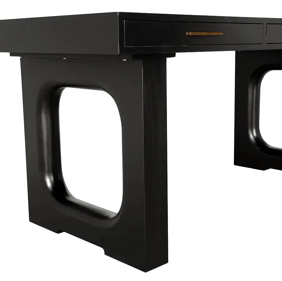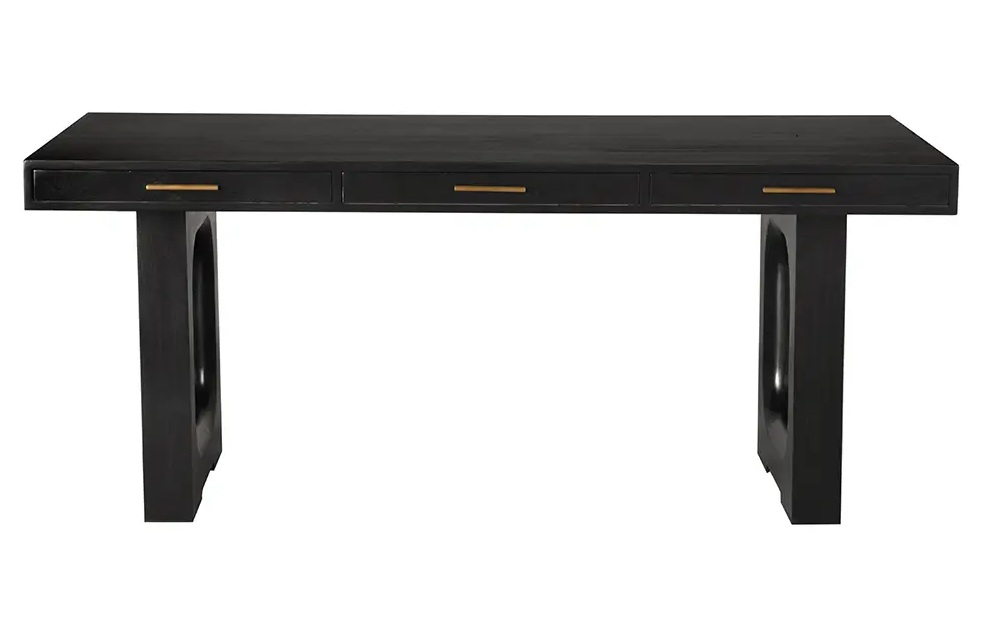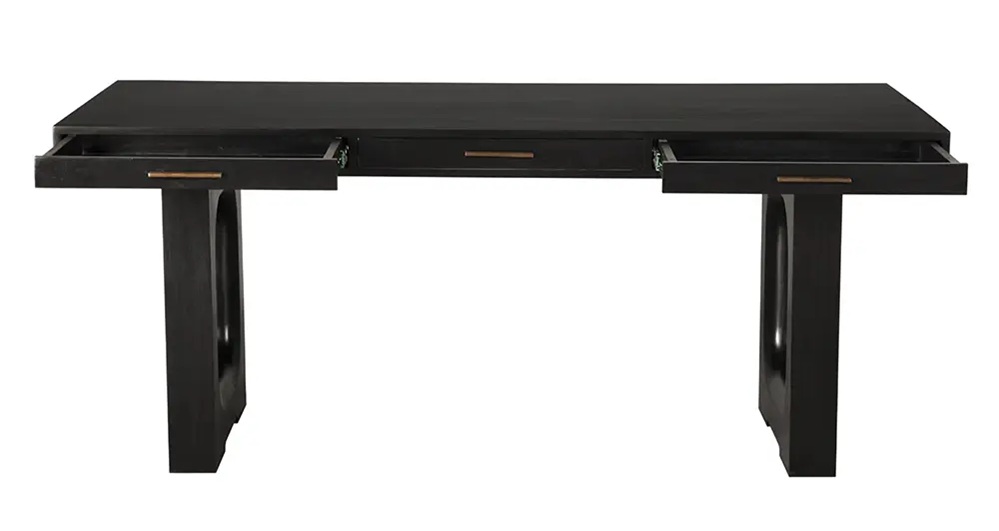 This three-drawer, modern Hand-Rubbed Black partners desk features a thick top, sleek drawers with linear pulls, and bold U-shaped bases. Its sculptural silhouette beautifully blends brutalist and Art Deco influences.