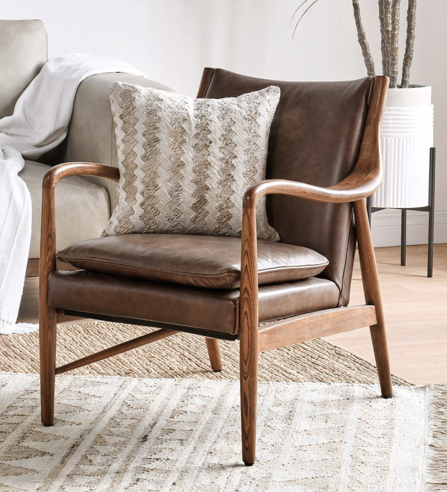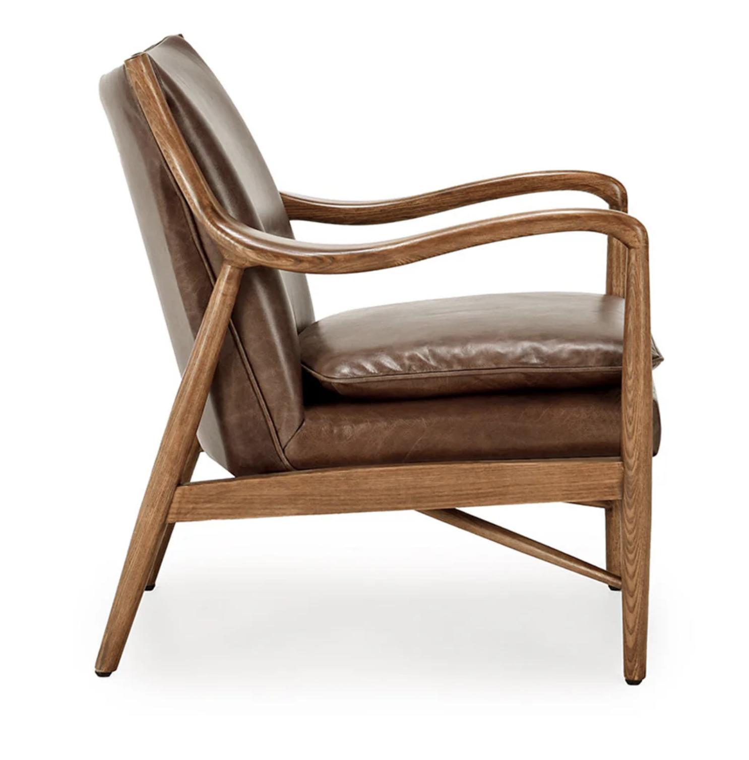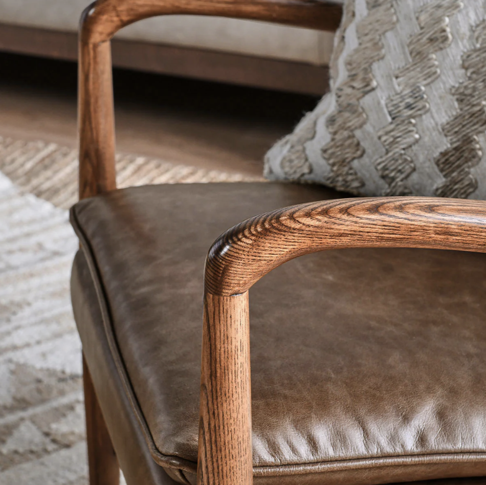 The frame is meticulously constructed from solid ash wood, expertly stained and lacquered to bring out the beautiful, natural wood grain. With its clean lines, subtly curved armrests, and sturdy build, this chair combines a refined, mid-century modern look with the enduring quality of natural materials. The top-grain leather ensures lasting durability and comfort, making this a piece you’ll enjoy for years to come.