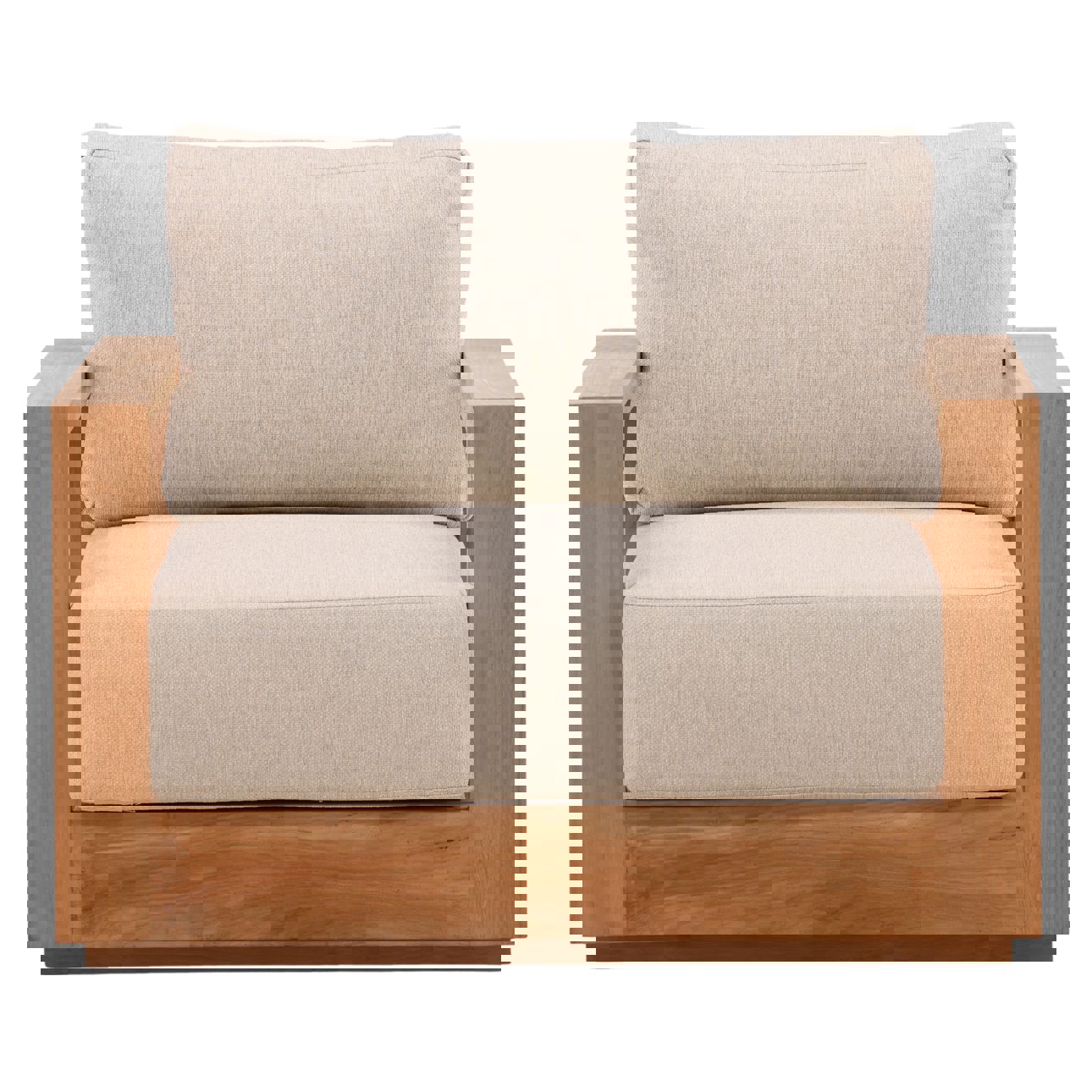 Pair of solid teak club chair in natural wood finish with weather-resistant Sand cushions. Perfect for outdoor use!