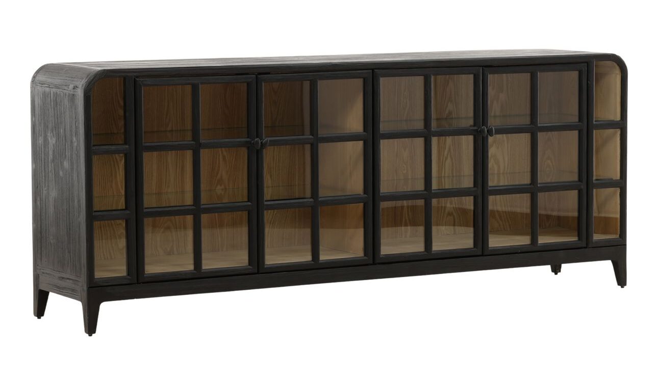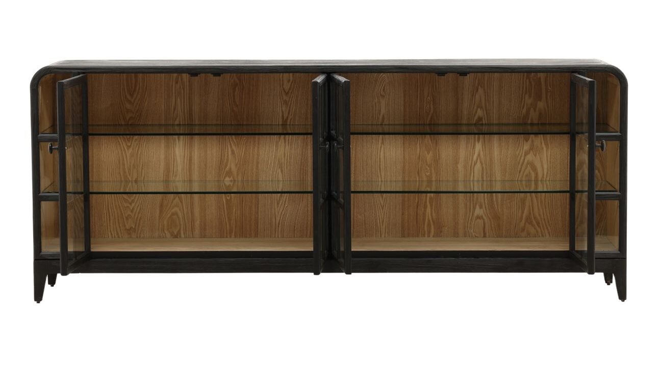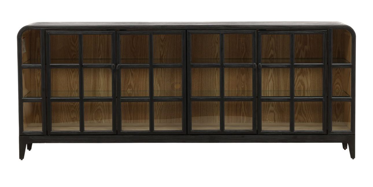 This four-door folding sideboard combines fir wood and tempered glass in a striking black and natural finish. Offering both storage and style, it’s a versatile piece perfect for modern, rustic, or transitional interiors.