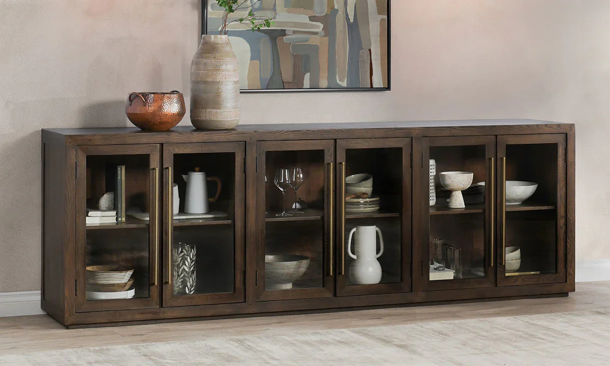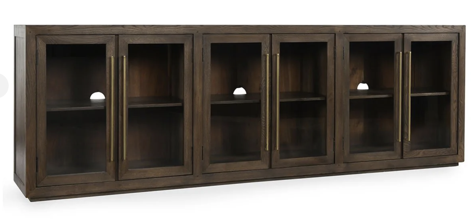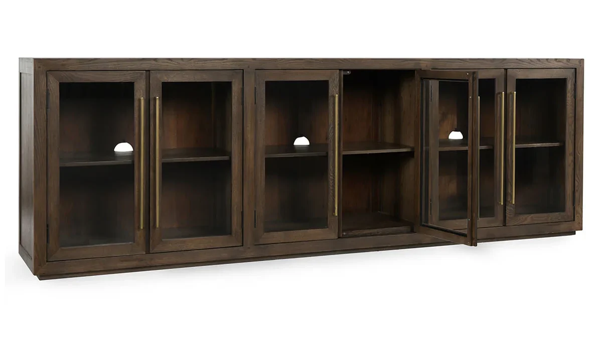 Elevate your space with the Bradley sideboard, a testament to classic craftsmanship and natural beauty. This display cabinet is finished with a water-based brown coating that accentuates the wood’s natural grain. Six doors accented by antique brass hardware, conceal abundant storage and the floating shelves provide added versatility for display. With its blend of timeless style and practical functionality, this collection is an ideal addition to any home. Available in Landmark Brown and White Wash.
