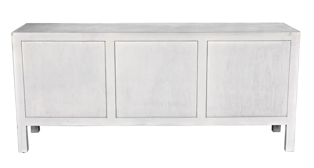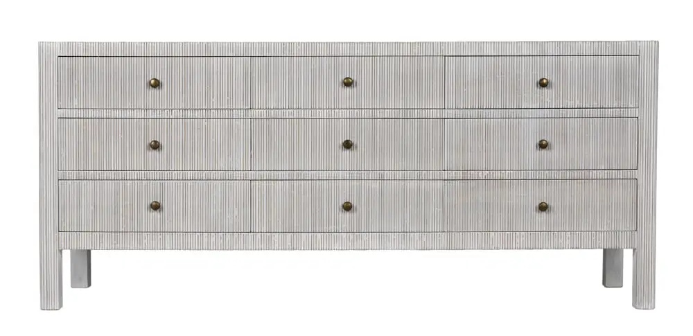 The Conrad Dresser features nine spacious drawers with hand-carved vertical ribbing and a soft white-wash finish that highlights the wood’s natural texture. Antique brass knobs add a classic touch, making this piece a stylish storage solution for coastal, transitional, or relaxed modern interiors.