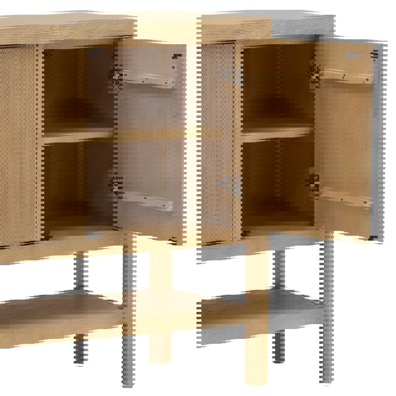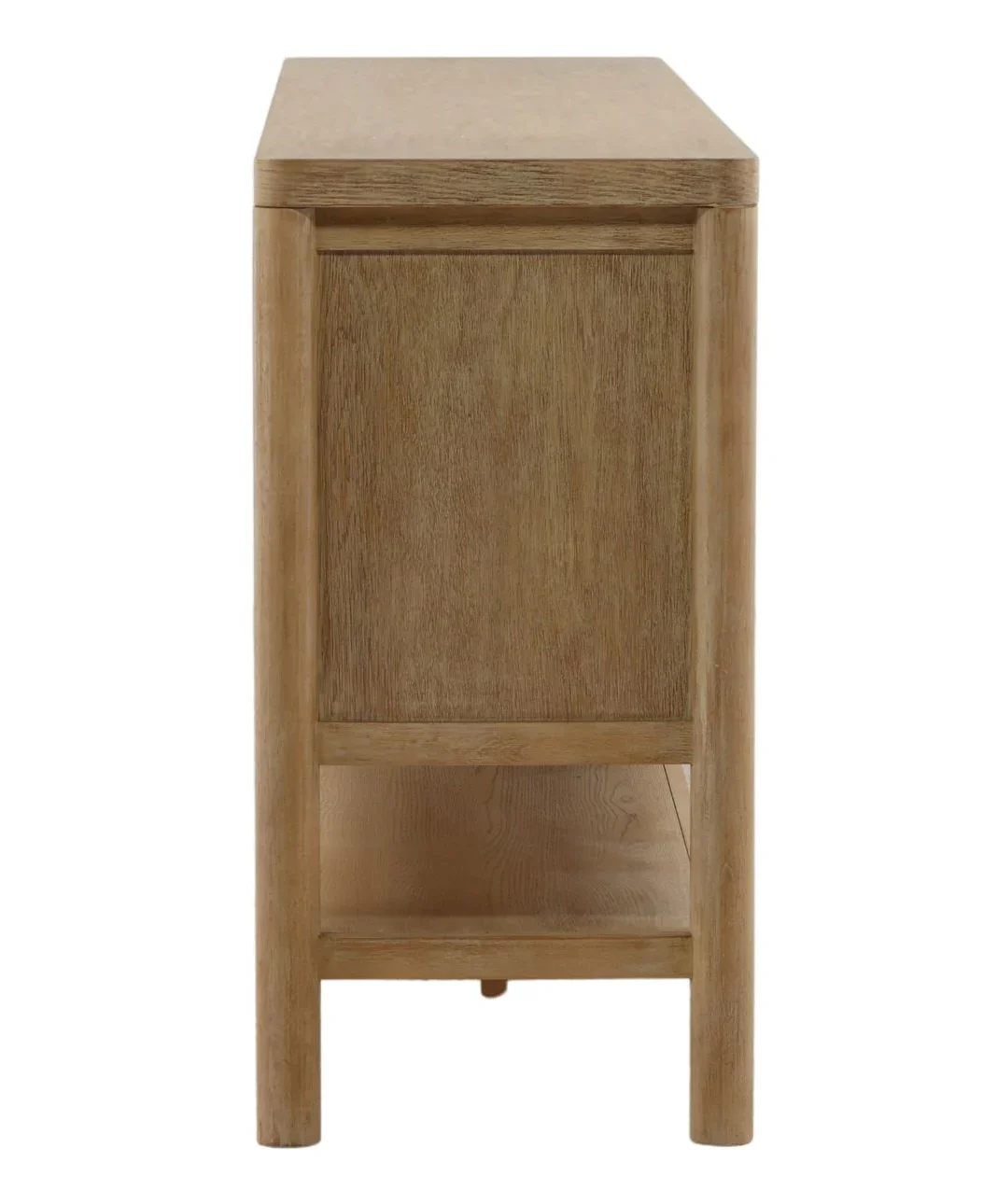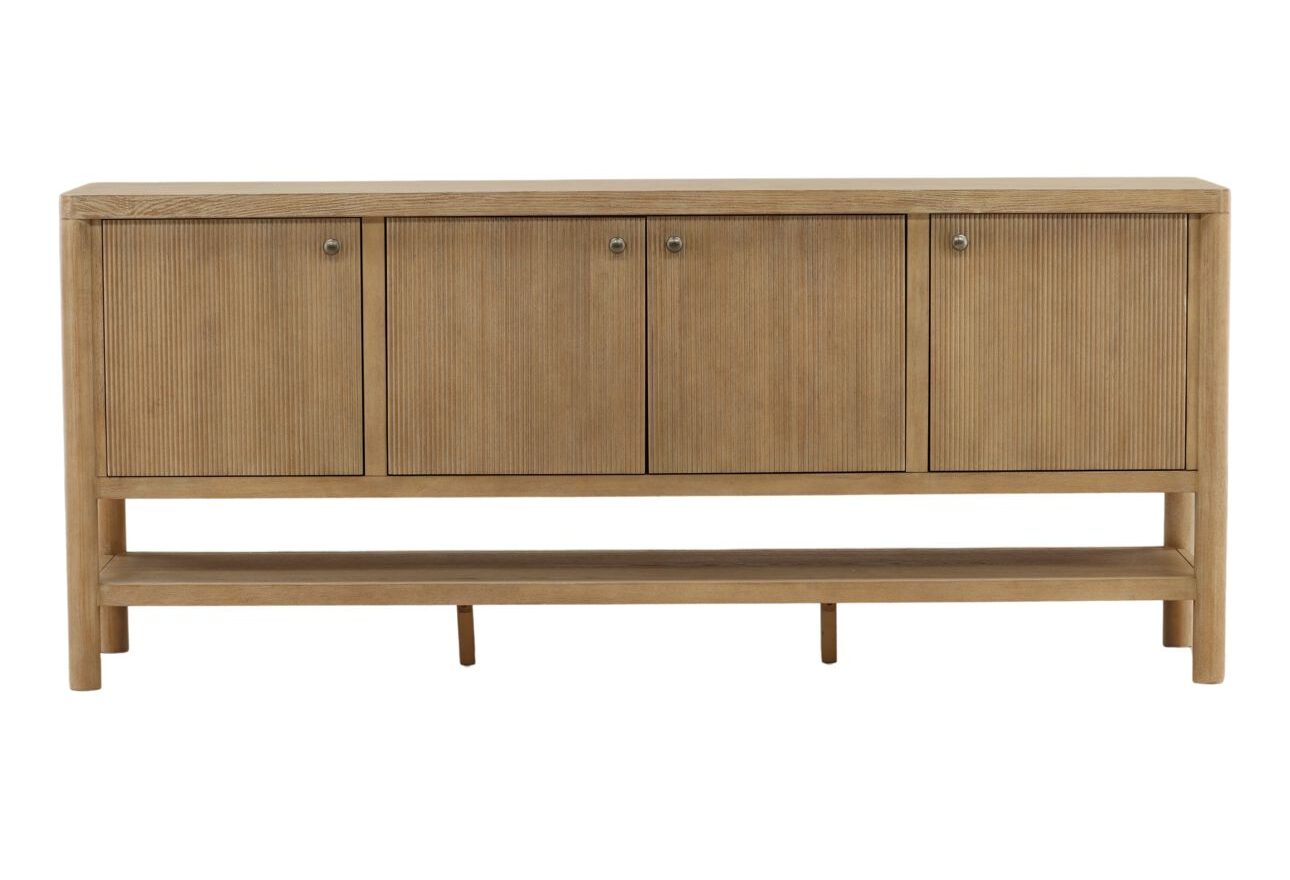 Bring timeless character and functionality to your space with this four-door sideboard crafted from durable rubber wood and Oak veneer. Finished in a Light Warm Wash, this piece features vertical reeded detailing, sleek round metal knobs, and a full-length lower shelf for added display or storage. Its slim profile and open base make it ideal for entryways, dining rooms, or living areas with a modern or transitional aesthetic.