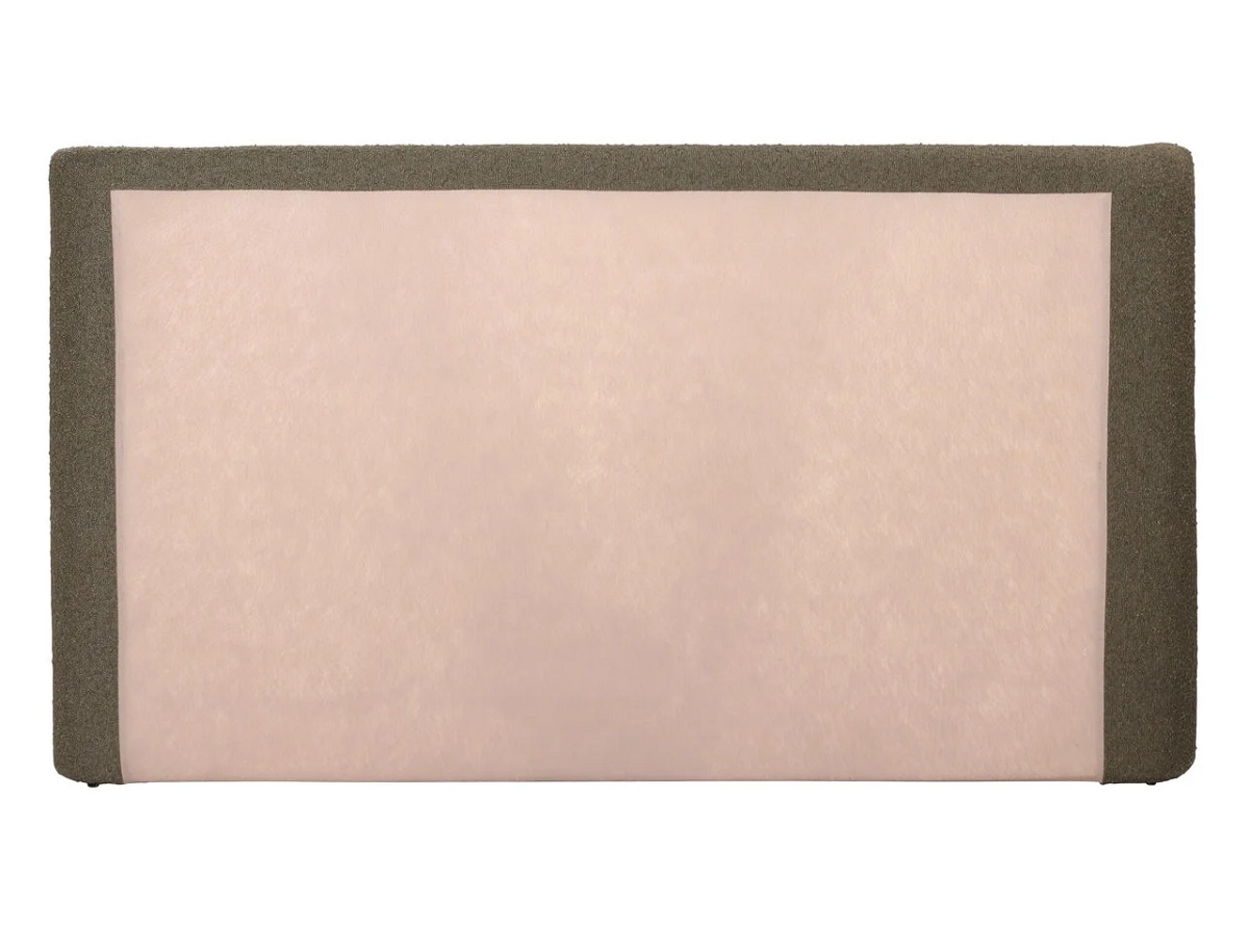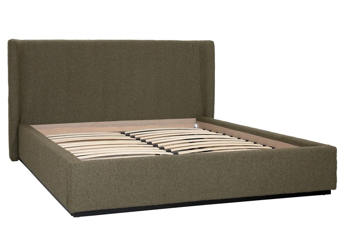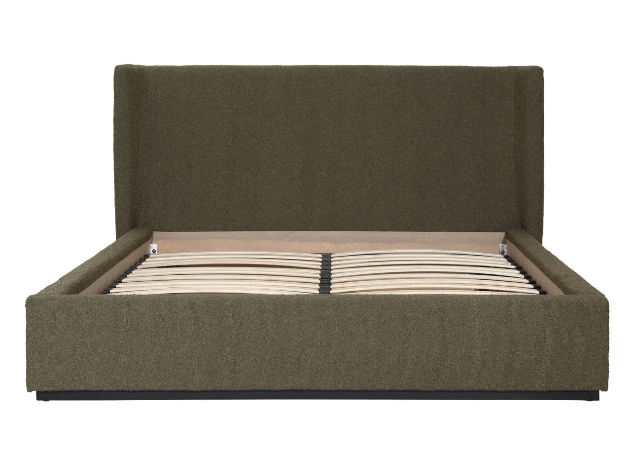 A modern shaped bed with a subtle wingback headboard. Featuring a low-profile frame, wrapped in an olive green boucle fabric that offers nearly endless options for pairing with more vibrant and neutral color palettes. It’s constructed with plush foam padding, making it the perfect blend of style and comfort.